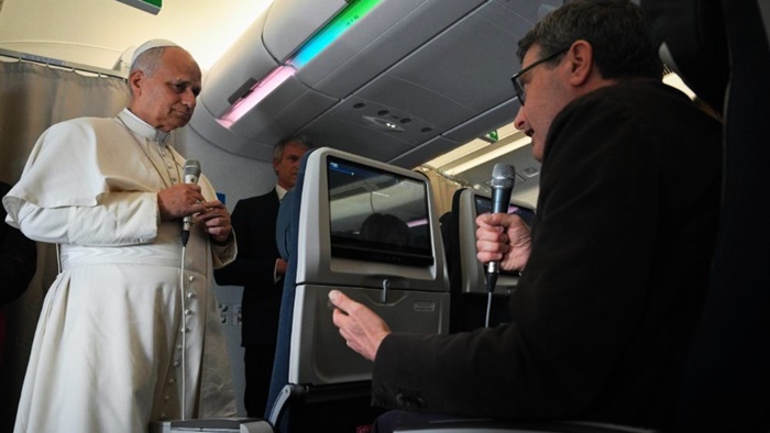No voo para Roma, Leão XIV reitera que sua primeira missão é anunciar o Evangelho. Lembra as crianças vítimas da guerra no Irã e no Líbano, condena a pena de morte e insiste no direito internacional. Sobre os migrantes, questiona: “O que o Norte faz pelo Sul do mundo?” e denuncia o fato de serem tratados pior que animais. Sobre os casais homossexuais, confirma que a Santa Sé não concorda com a bênção formalizada adotada na Alemanha, mas reforça o princípio de acolhida a "todos, todos, todos".