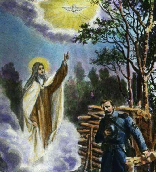 Além das tarefas materiais e quotidianas, Santa Teresinha, percebia que devia dar sua vida para conquistar almas para Deus, uma missão que não tem hora, nem lugar e nem fim. Santa Teresinha não agradou a Deus só com suas obras, mas participando em tudo na missão divina de seu Filho, a missão da Igreja. Ela deu testemunho que contemplar e interceder é participar ativamente da redenção, junto à cruz. Assim ela fez e continua fazendo. Santa Teresinha não assumiu a intercessão como uma tarefa a partir de sua morte, e a promessa «passarei o meu céu fazendo o bem na terra»[25] foi apenas a conseqüência de um apostolado que havia assumido na Terra.