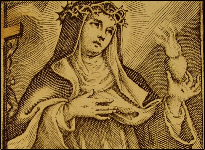 A esta alma eleita, para quem parecia que não existiam mais as barreiras entre o tempo e a eternidade diante dos êxtases constantes, durante os quais mergulhava na contemplação do mistério de Cristo, muitas vezes o Senhor mostrou o seu Coração divino. Entre ardentes chamas e raios brilhantes, como símbolo do imenso amor que trazia pelos homens, a Santa viu o Coração de Jesus, aquele Coração de carne, ferido pela lança, que então a ela se revelava assim como um século mais tarde se revelou a Santa da Visitação, Santa Margarida Maria Alacoque: era como "o ninho" do amor de Jesus pelos homens (II 346), amor imenso, que se fez patente pela chaga que nele abriu a lança do centurião (II 431).