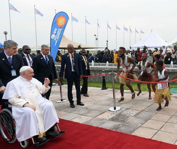 Francisco proferiu a palavra Esengo que significa alegria, manifestando a imensa alegria de ver e encontrar os congoleses. "Desejei muito este momento. Obrigado por terdes vindo aqui", disse ele.