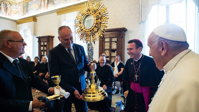 "A Eucaristia nos impele a um amor fortemente comprometido com o próximo, porque não podemos realmente entender e viver seu significado se mantivermos nossos corações fechados para nossos irmãos e irmãs, especialmente por aqueles que são pobres, sofredores, exaustos ou perdidos na vida", afirmou Francisco ao receber no Vaticano o comitê organizador da 10ª edição do Congresso Eucarístico Nacional do Estados Unidos. Evento acontece em julho de 2024, em Indianápolis.