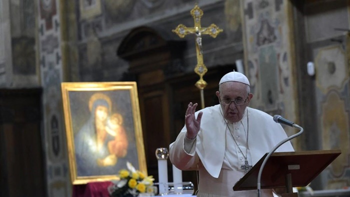 A seguir, o Papa se lembrou de uma "pintura antiga da Odigitria na Catedral de Bari, simples. Nossa Senhora que mostra Jesus nu. Depois, colocaram nele uma roupa para cobrir a nudez, mas a verdade é que Jesus, nu, ele mesmo homem que nasceu de Maria, é o mediador e ela mostra o mediador. É a Odigitria". "Na iconografia cristã a sua presença está em toda parte, às vezes até com grande destaque, mas sempre em relação ao Filho e em função d'Ele. As suas mãos, o seu olhar, a sua atitude são um “catecismo” vivo e indicam sempre o âmago, o centro: Jesus. Maria está totalmente voltada para Ele a ponto de que podemos dizer que é ela mais discípula do que mãe. A indicação nas Bodas de Caná. Ela sempre mostra Cristo. É a primeira discípula", sublinhou.