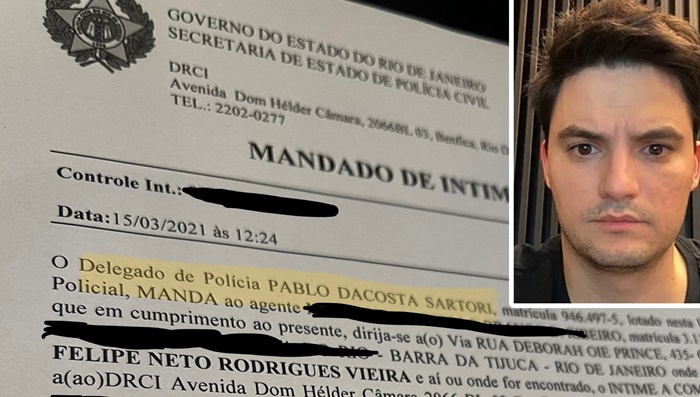 Felipe Neto recebeu nesta segunda-feira (15) uma intimação da Polícia Civil do Rio de Janeiro para comparecer à Delegacia de Repressão aos Crimes de Informática. Segundo ele contou no Twitter, onde mostrou a intimação, terá que responder por crime contra a segurança nacional por ter chamado o presidente Jair Bolsonaro (sem partido) de genocida. Em nota, a Polícia Civil disse que Felipe foi intimado após o vereador Carlos Bolsonaro (Republicanos - RJ) protocolar uma petição comunicando crime contra segurança nacional.