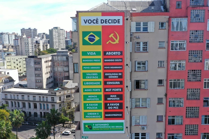 Painel gigante instalado em edifício residencial de Porto Alegre convoca para atos de 7 de Setembro e sugere que eleições opõem o Brasil a comunistas, associados ao PCC, à censura e ao narcotráfico - Helder Martins/Dhidrone