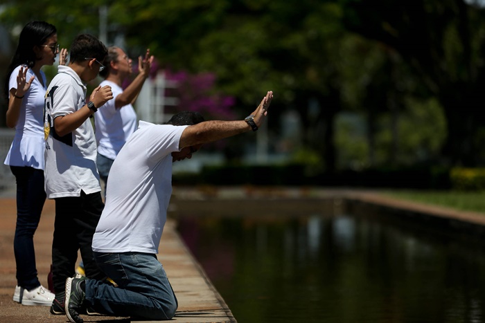 Mais cedo, grupos de evangélicos se reuniram em frente ao Palácio da Alvorada para jejuar e rezar pelo presidente Bolsonaro. Após o chefe do Executivo e líderes religiosos convocarem a população para um jejum nacional, fiéis foram a té a residência oficial do presidente para fazer orações para que o país supere a crise do novo coronavírus.