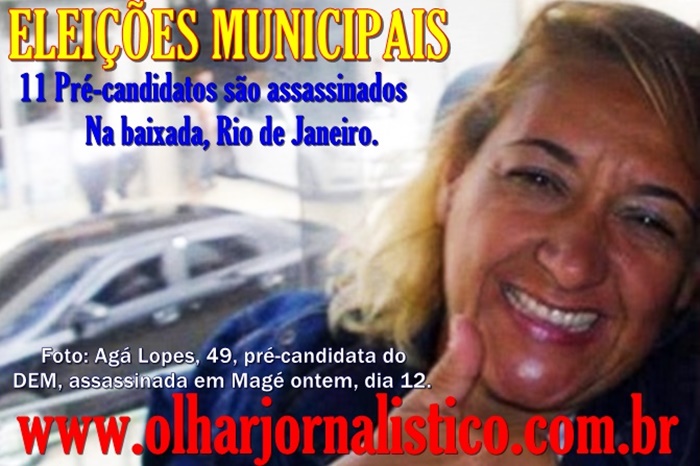 A três meses das eleições municipais, a pré-candidata a vereadora Agá Lopes Pinheiro (DEM), 49, foi assassinada a tiros na noite desta terça-feira (12), na cidade de Magé, no Rio de Janeiro. Este é o 11º homicídio contra políticos e/ou pré-candidatos em cidades da Baixada Fluminense desde novembro do ano passado.