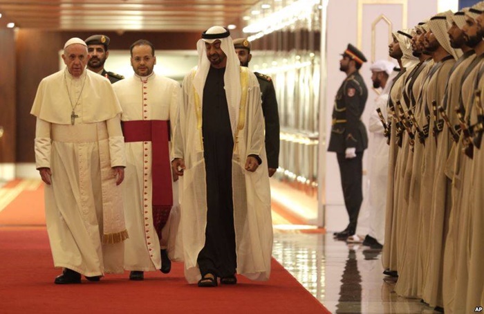 Francisco foi recebido pelo príncipe herdeiro de Abu Dhabi, xeque Mohamed bin Zayed al-Nahyan, e pelo imã de Al-Azhar, a instituição mais importante do Islã sunita, sediada no Cairo, xeque Ahmed al-Tayerbiman, a quem o Pontífice abraçou.