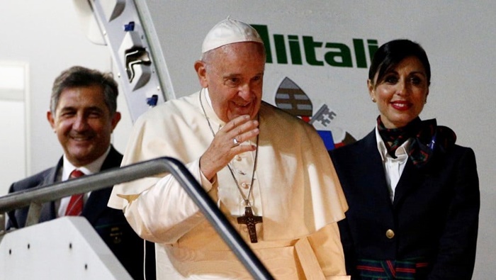 Escoltado pela Polícia de Estado e por seguranças do Vaticano, o Ford Fiesta com o Papa Francisco ingressou na área da pista às 18h45, parando junto ao Airbus A-330 batizado "Giovanni Battista Tiepolo". Antes de subir a bordo, o Santo Padre saudou autoridades civis e militares e depois deu a mão aos dois carabineiros em uniforme de gala posicionados junto à escada, subindo então carregando sua maleta preta, como costuma fazer.