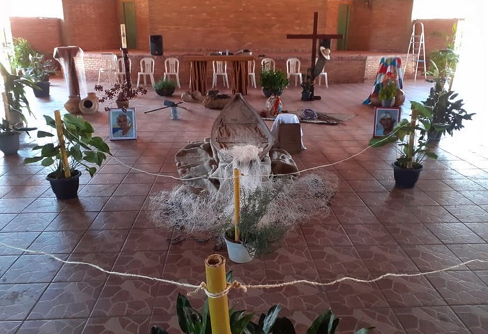 Em São Félix Casaldáliga será velado em uma canoa indígena. À direita, um remo do Povo Iny que ele trocou pelo báculo e um chapéu de palha sertanejo, que adotou em vez da mitra.