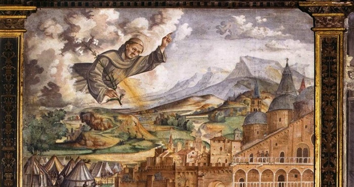 Afresco atribuído ao pintor Filippo da Verona e provavelmente feita em 1510 mostra Santo Antônio em aparição a seu confrade e seguidor Luca Belludi.