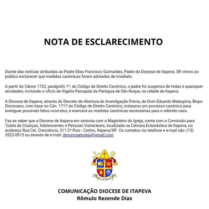 "Diante das notícias atribuídas ao Padre Elias Francisco Guimarães, Padre da Diocese de Itapeva, SP, vimos ao público esclarecer que medidas canônicas foram adotadas de imediato", diz o comunicado publicado na página da diocese no Facebook. "A Diocese de Itapeva, através do Decreto de Abertura de Investigação Prévia, de Dom Eduardo Malaspina, Bispo Diocesano, com base no Cân. 1717 do Código de Direito Canônico, instaurou um processo canônico para averiguar possíveis fatos ocorridos, e exercerá as medidas canônicas necessárias para o referido caso". O padre Elias é vigário paroquial da Paróquia de São Roque, na cidade de Itapeva.