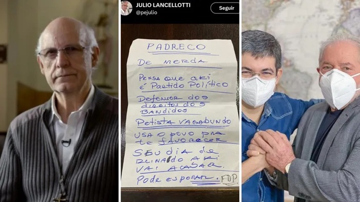 "Padreco de merda, pensa que aqui é partido político. Defensor dos direitos dos bandidos. Usa o povo para te favorecer. Seus dias de reinado vão acabar. Pode esperar", diz a nota. No ano passado, padre Júlio Lancelotti declarou apoio à eleição de Lula e deu declarações favoráveis ao então candidato.