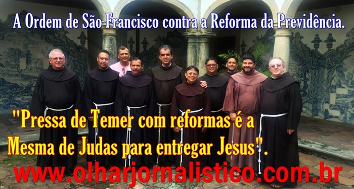 A Conferência dos Frades Menores do Brasil, da Ordem fundada por São Francisco em 1209, lançou uma nota dura contra as reformas do governo Temer no Dia Nacional de Mobilização (31 de março). Os franciscanos compararam a pressa do governo Temer em aprovar as reformas com a pressa de Judas para entregar Jesus aos poderosos de então: “O ritmo célere da tramitação de propostas polêmicas em torno de temas delicados faz-nos recordar a pressa de Judas Iscariotes para entregar Jesus aos poderosos. Neste caso, entregue de bandeja ao interesse dos detentores do poder e do dinheiro está o povo brasileiro, especialmente os mais simples: trabalhadores e assalariados.” A nota tem o título de Carta Aberta ao Povo Brasileiro contra a Subtração de Direitos Fundamentais. A carta foi publicada no Blog Caminho para Casa, 31-03-2017.