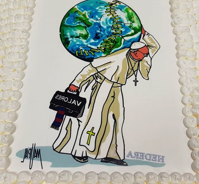 O bolo para a ocasião era de pera e canela envolto por glacê branco, e decorado com a imagem do Papa Francisco carregando a Terra nas costas, que representa a força do aniversariante de unificar e apaziguar os conflitos. A imagem é do grafiteiro italiano MauPaul.