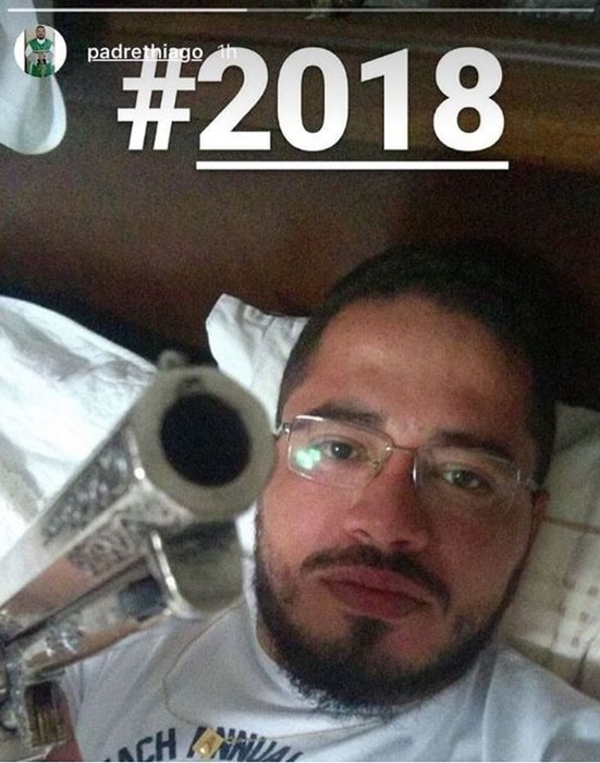 Uma postagem do padre Thiago Bruno da Paróquia de São José dos Quatro Marcos, município a 343 km de Cuiabá, causou polêmica nesta terça-feira (2). Numa foto publicada no WhatsApp Status, o padre aparece deitado numa cama apontando uma arma e a mensagem #2018 escrita. A foto circula nas redes sociais.