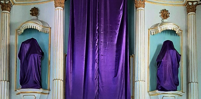 Hoje cobrimos as imagens para simbolizar o período de penitência que estamos vivendo. Na sua paixão foi Jesus que nos cobriu com o manto todo especial, não roxo, mas vermelho era o manto de seu sangue, cobria a multidão dos pecados da humanidade para a modificar por dentro. Por tanto ele espera uma mudança de nosso coração. As imagens em alguns lugares agora estão cobertas pedindo de cada um de nós uma verdadeira conversão interior nesta quaresma.