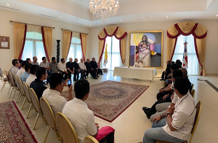 Às 15h45 de 26 de janeiro de 2019, o Papa Francisco reuniu na Nunciatura do Panamá 30 jesuítas da província da América Central, que inclui os territórios do Panamá, Costa Rica, Nicarágua, El Salvador, Honduras e Guatemala. Entre eles, o provincial, p. Rolando Enrique Alvarado López, o mestre de noviços, pe. Silvio Avilez e 18 jovens noviços. Assim que Francisco entrou na sala de reuniões, os jesuítas cantaram a canção "En todo amar e servir", bem conhecida na Companhia de Jesus, e depois saudaram a todos, um por um, antes de se sentar e começar a conversa.. (Antonio Spadaro SI)