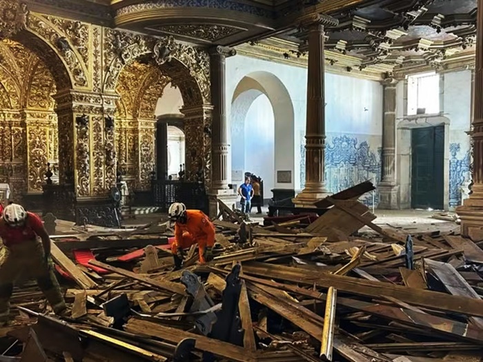 O interior da Igreja da Ordem Primeira de São Francisco, em Salvador, onde teto desabou — Foto: Defesa Civil de Salvador/05-02-2025