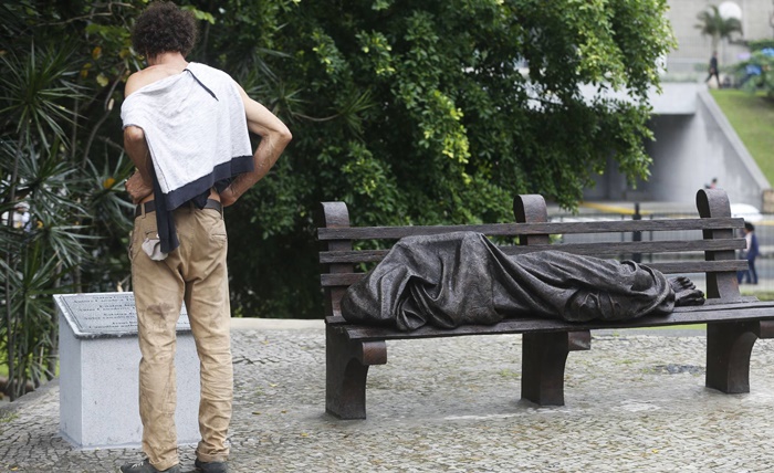 Estátua retrata Jesus Cristo como morador de Rua, no Rio de Janeiro, em novembro de 2018. 'Jesus sem teto', de autoria do canadense Timothy P. Schmalz, foi instalada no jardim da Catedral Metropolitna do Rio FERNANDO FRAZÃO AGÊNCIA BRASIL