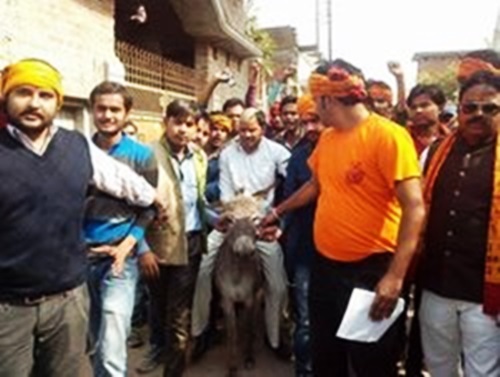 Como forma de humilhação, rasparam metade da sua cabeça, uma sobrancelha e um lado de seu bigode. Depois, o colocaram em um jumento e o levaram em procissão pela cidade de Orai, no estado de Uttar Pradesh.