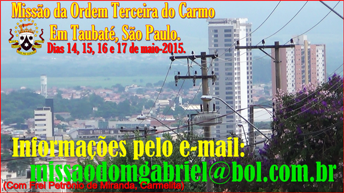 CONVITE: Missão da Ordem Terceira do Carmo em Taubaté, São Paulo- Paróquia São João Bosco- Dias; 14, 15, 16 e 17 de maio-2015. PARTICIPE! Informações com Frei Petrônio de Miranda, Carmelita. E-mail: Este endereço de email está protegido contra piratas. Necessita ativar o JavaScript para o visualizar.