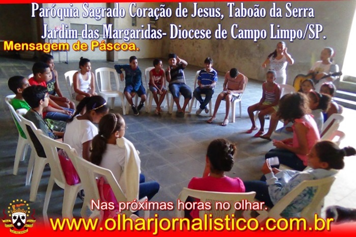 No vídeo, as crianças da Paróquia Sagrado Coração de Jesus, Diocese de Campo Limpo- Jardim das Margaridas- Taboão da Serra, São Paulo, através de uma música, deixam a sua mensagem de Páscoa. CÂMERA E REPORTAGEM: Frei Petrônio de Miranda, Padre Carmelita e Jornalista/AL. Jardim das Margaridas, Taboão/SP. 04 de abril-2015. DIVULGAÇÃO: www.mensagensdofreipetroniodemiranda.blogspot.com