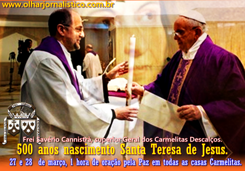 Ocorre no dia 28 deste mês de Março, 500 anos do nascimento de Santa Teresa de Jesus, ou Santa Teresa de Ávila, como é também conhecida esta Virgem e Doutora da Igreja. A pedido do Superior Geral dos Carmelitas Descalços, o Papa Francisco aceitou que nos dias 27 e 28 todas as comunidades carmelitas do mundo, dediquem uma hora de oração pela paz na Terra.