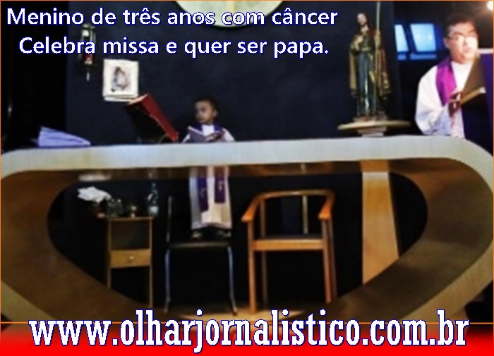 Rafael Freitas usa vestes sacerdotais, enquanto acompanha a realização de missa rezada pelo padre João Borges, no Hospital do Câncer de Barretos, no interior de São Paulo. Rafael sonha em tornar-se papa e, um dia, celebrar a Santa Comunhão na Capela Sistina, no Vaticano. Fonte:http://m.noticias.bol.uol.com.br