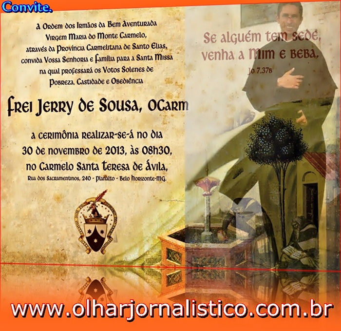 Profissão Solene dos Votos Religiosos de Pobreza, Castidade e Obediência- Frei Jerry de Sousa, O. Carm. Data: 30/11/2013 - Festa de Santo André, Apóstolo e Mártir. Local: Carmelo Santa Tereza D'Avila-Planalto. Rua Sacramentinos, 240, Belo Horizonte- MG (Os junioristas; Frei João Paulo, Frei Thiago Borges e Frei Marlom Moreira renovarão seus votos também neste dia).