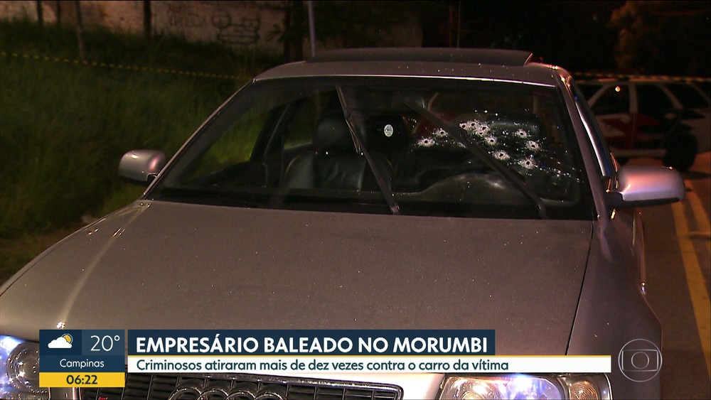 Um empresário foi baleado por criminosos na região do Morumbi, na Zona Sul de São Paulo, na noite desta quarta-feira (21), após parar o veículo em um semáforo. O carro da vítima foi atingido por mais de dez tiros e ele sobreviveu. Ninguém foi preso.