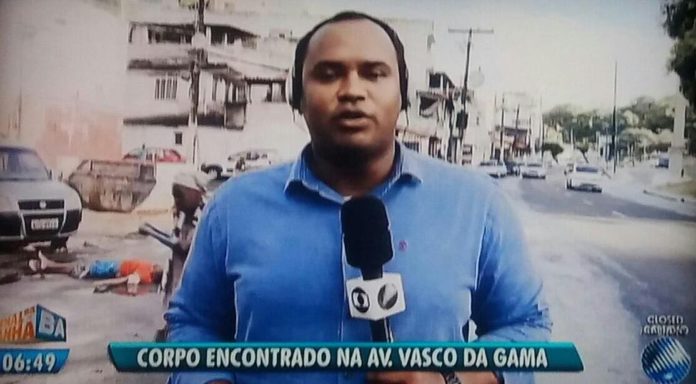 O repórter Vanderson Nascimento entrava ao vivo contando tudo. O problema foi o que ocorreu ao fundo. Por conta do enquadramento, era possível ver, ao fundo, o corpo do homem morto.
