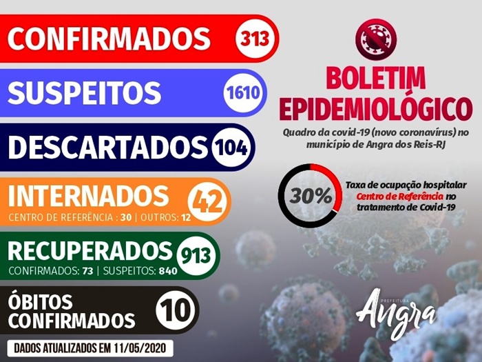De 01 de janeiro de 2020 até às 18 horas desta segunda-feira (11), o município de Angra dos Reis apresentou 2.027 casos notificados. No momento, há 313 casos confirmados de coronavírus – 78 pacientes testaram positivo em exames feitos pelo Laboratório Central Noel Nutels (Lacen) e 235 pelo teste rápido. Destes, 73 já estão recuperados. Há dez mortes confirmadas pela doença na cidade. Os dois últimos óbitos foram de duas mulheres: uma de 90 anos e outra de 56 anos, que estavam internadas.