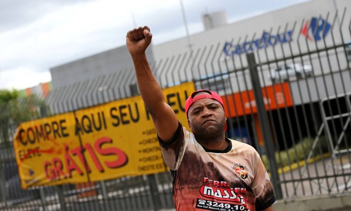 Jorge Luiz Ritta de Oliveira, 45, ergue punho cerrado em protesto em frente ao supermercado Carrefour, onde Beto foi espancado até a morte por seguranças Foto: DIEGO VARA / REUTERS