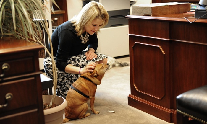 Courtney Ellis, funcionária dos bichinhos de estimação do escritório do senador Christoper Bond Pooley, um cachorro de escritório de chihuahua pertencente à diretora de comunicações Shana Marchio (NP) em Washington, DC em 6 de maio de 2010. Foto: VCG