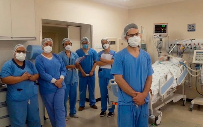 Profissionais de saúde acompanham cerimônia de batismo e crisma no CTI do HC Ribeirão Preto, SP — Foto: Divulgação/HC Ribeirão Preto