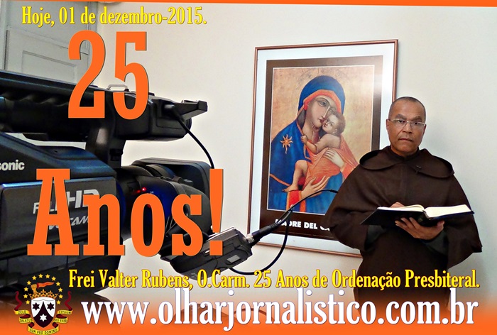Neste dia 01 de dezembro de 2015, o Frei Valter Rubens, O. Carm, do Convento do Carmo da Lapa, Rio de Janeiro, louva ao Bom Deus e a Virgem do Carmo pela passagem dos 25 Anos de Ordenação Presbiteral (1990-2015). Para celebrar o Jubileu de Prata, as Comunidades Carmelitanas terão a alegria de festejar passagem importante do confrade.