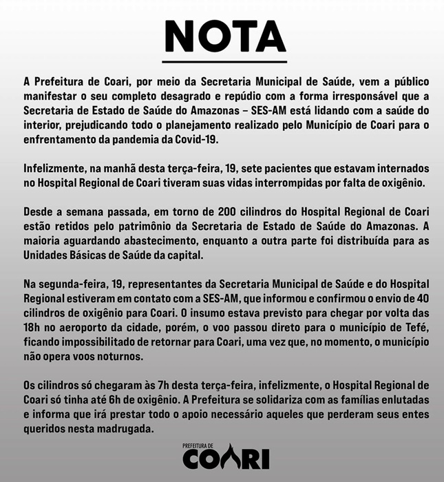 Wilson Lima disse que, para atender a demanda dos hospitais públicos e privados, as fornecedoras White Martins, Carbox e Nitron precisavam entregar 76.500 metros cúbicos (m³) diariamente. No entanto, as empresas só conseguem fornecer 28.200 m³/dia. “Para sanar o déficit de 48.300 m³ diários, a operação está buscando em Fortaleza e São Paulo o insumo para trazer em aviões da Força Aérea Brasileira (FAB)”, disse. O governador não informou quantas pacientes morreram asfixiados nos hospitais de Manaus.